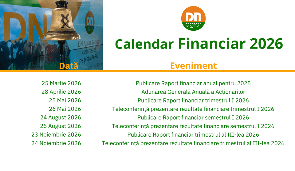 Principalele aspecte precizate în cadrul teleconferinței au fost: ✅ Performanța Financiară din 2025: DN AGRAR a raportat cel mai bun an din istoria companiei, cu rezultate record. - Cifra de Afaceri: A atins 213 milioane RON, o creștere de 21% față de 2024. - Profitul Net: A urcat spectaculos la 52 milioane RON, reprezentând o creștere de 65%. - EBITDA: A crescut cu 37% ajungând la 97 milioane RON. ✅ Repere Operaționale: DN AGRAR își continuă parcursul de creștere și consolidare strategică, susținut de o execuție operațională solidă. - Producția de Lapte: Peste 70 de milioane de litri de lapte livrați, reprezentând o creștere de 13% față de 2024. - Efectivul de Animale: Șeptelul de animale a crescut cu 11% ajungând la aproximativ 18.000 de capete (atât vaci de lapte, cât și tineret bovin). - Produția de Cereale: În anul 2025, sectorul agricol s-a confruntat cu provocări climatice semnificative, în special precipitații insuficiente, care au determinat randamente mai scăzute pentru culturi precum lucerna și porumbul siloz. Reziliența a fost menținută prin utilizarea tehnicilor de agricultură de tip no-till (fără arătură).
