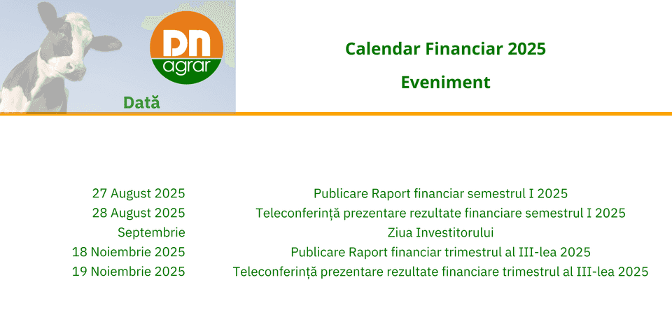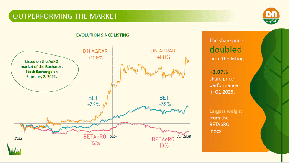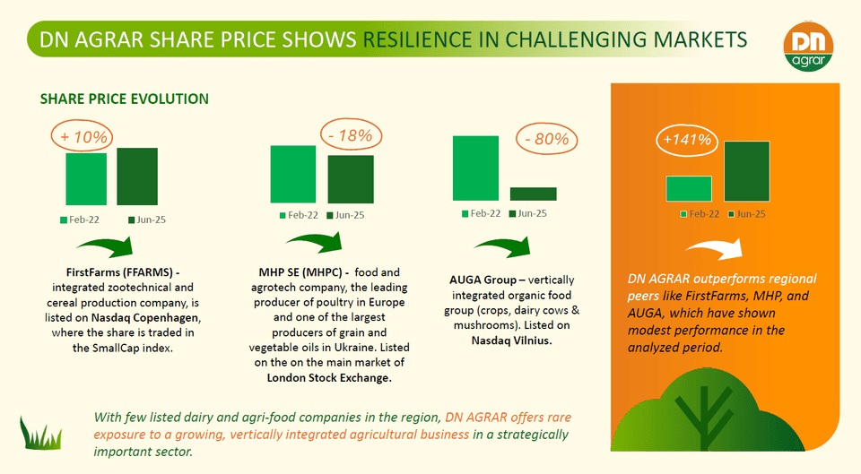 - Prețul acțiunilor DN AGRAR a demonstrat reziliență în condiții de piață provocatoare – Având în vedere numărul redus de companii listate din domeniul lactatelor și agroalimentar din regiune, DN AGRAR oferă o expunere rară la o afacere din domeniul agricol integrată vertical, aflată în creștere, într-un sector strategic important.