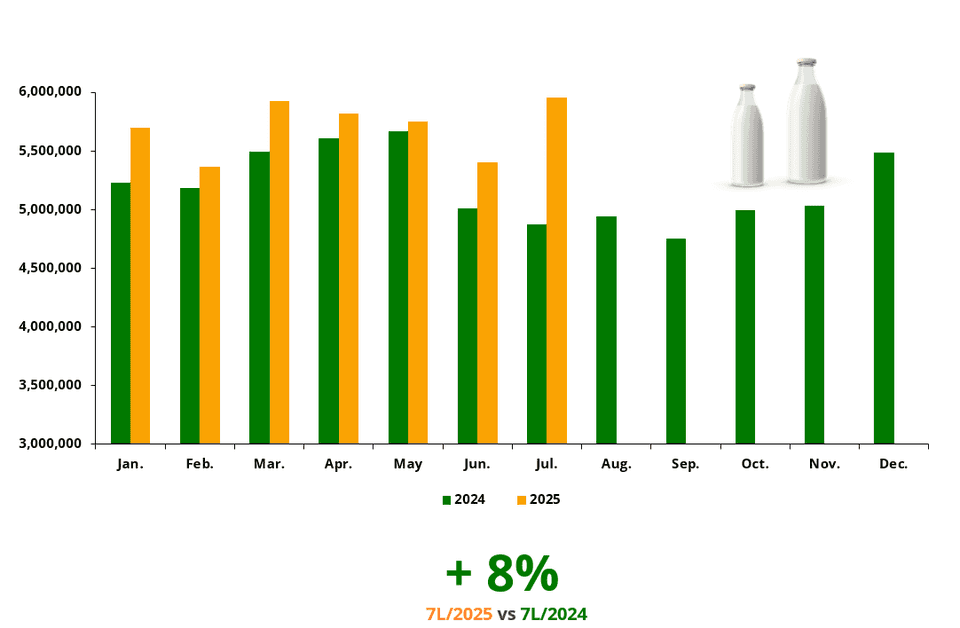 🐄 În primele 7 luni ale anului 2025, cantitatea de lapte livrată a crescut cu 8% comparativ cu aceeași perioadă din 2024.