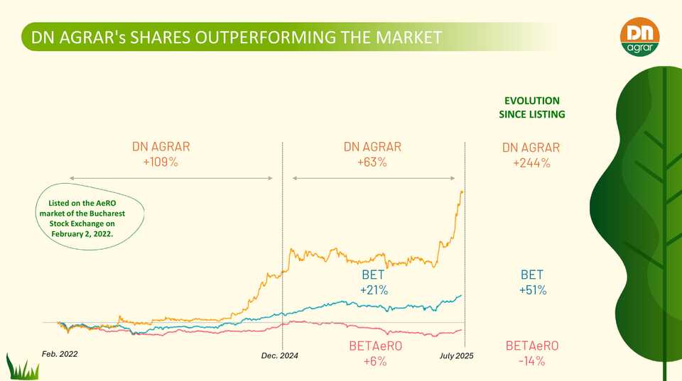 - În primele șapte luni din 2025, acțiunile DN AGRAR au înregistrat o apreciere spectaculoasă de 63%.