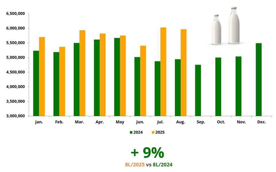 🐄 În luna august 2025, volumul de lapte livrat a înregistrat un avans de aproximativ 21%, comparativ cu luna august a anului trecut.