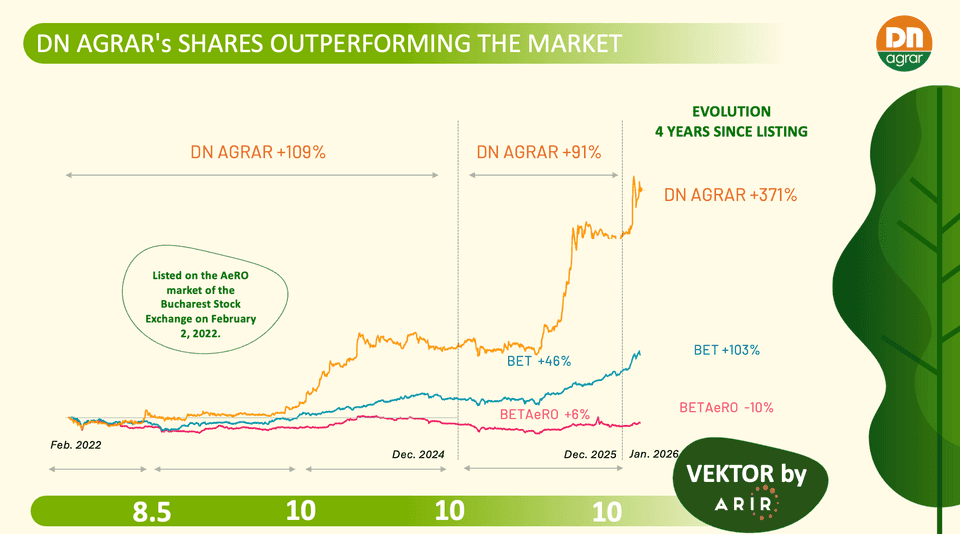 ✅ Since listing four years ago, DN AGRAR's share price has increased by 371%, the company’s market capitalization reaching RON 525 million on January 30th, 2026.