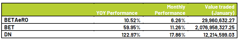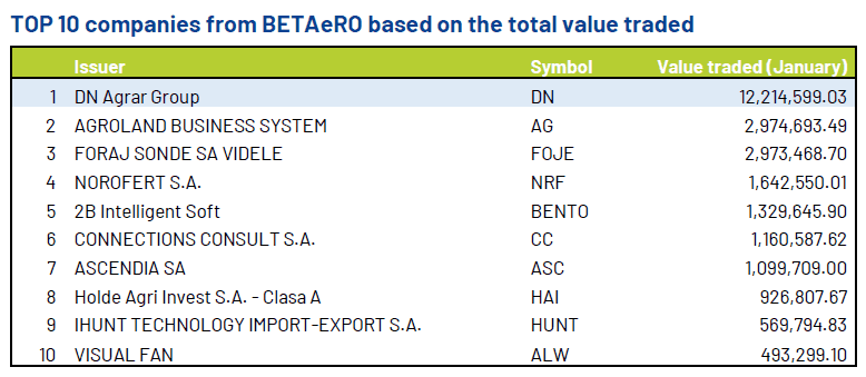 ✅ In January 2026, DN AGRAR maintained a strong trading pace, ranking 1st place within the BETAeRO index by total value traded, with RON 12.2 million, accounting for almost 41% of the index’s total trading value.